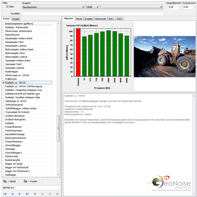 - เครื่องมือสร้าง Noise Map: แผนที่เสียง, ตารางผลกระทบ, และวัตถุช่วยในแผนที่ เช่น กำแพงกันเสียง, พื้นที่ดูดซับเสียง, อาคาร, ความแตกต่างระดับพื้นดิน (DGM)