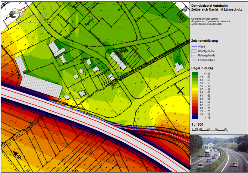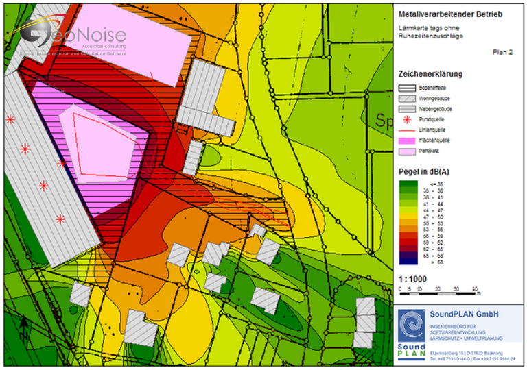 - จัดทำรายงานด้วยกราฟ ตาราง และ Noise Map พร้อมคำแนะนำ เช่น ความสูงและตำแหน่งของกำแพง, วัสดุ และค่าระดับเสียงที่ลดลง